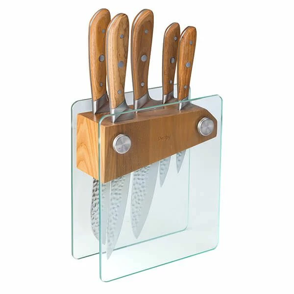 This Denby Ash Wood Glass 5 Piece Knife Block Set, is made from tempered glass, Ash wood central block to keep knives safely stored.