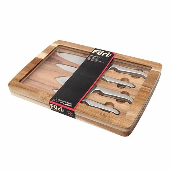 This Furi Pro acacia 4 piece knife set includes a 20cm cook’s knife, a 15cm serrated multi purpose knife, a 13cm east/west santoku knife and a 9cm paring knife.
