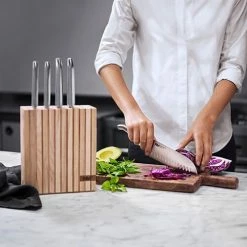 These knives are stored in a stunning contemporary wooden block made from Sapele (an exotic dark wood) and rubberwood. Also included is a Diamond Fingers Knife Sharpener to keep your knives super sharp.