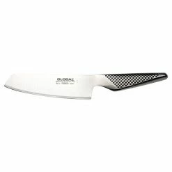 GLOBAL GS-5 14cm VEGETABLE CHOPPER KNIFE – this is a really popular blade which takes its inspiration from Japanese Usuba (vegetable) knives. The flatter part of the blade is designed to chop through vegetables and fruit, coming into full contact with the chopping board to give a clean cut. The curved section at the front of the blade allows the knife to be rocked forward gently after each cut to encourage good technique.