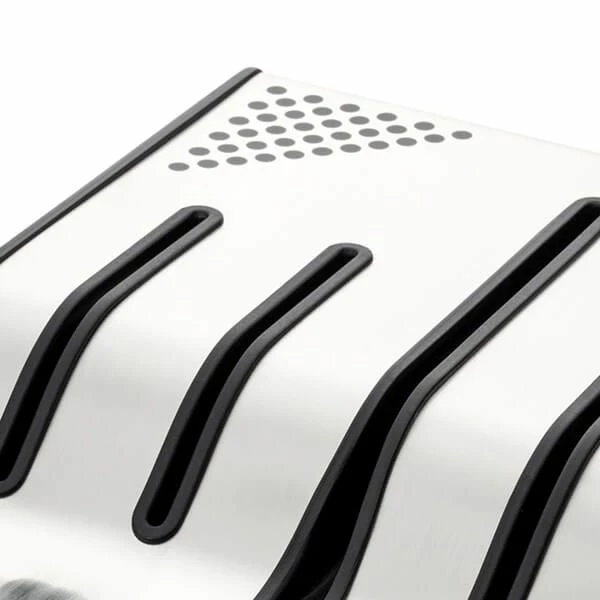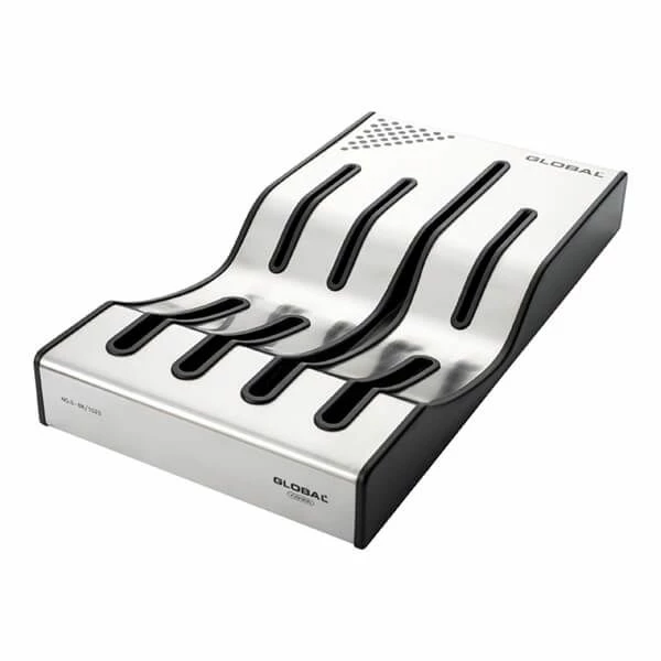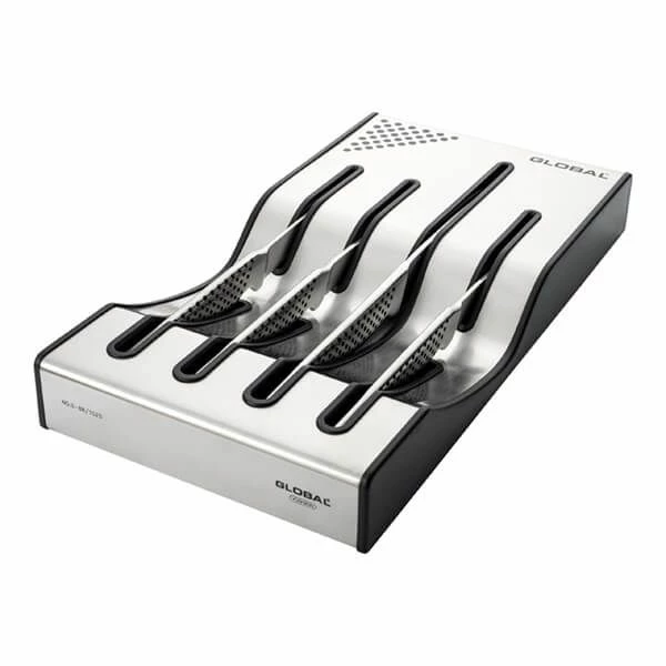 A stainless steel knife dock ensures these Global peeling knives are always close to hand and protects you and the knives when storing in a drawer.