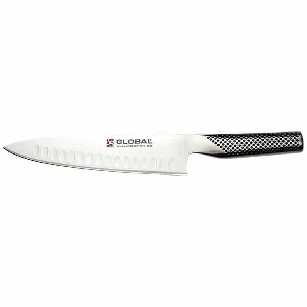 The Global GS-96AN 35th Anniversary 19cm Fluted Chef’s Knife features the Global 35th Anniversary logo on the blade.