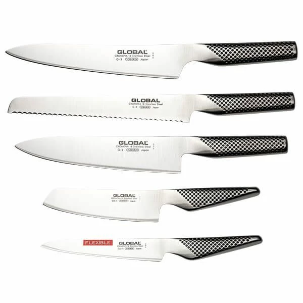This Global G-88239511 5 Piece Kitchen Knife Set with Storage Dock comprises a G-2 20cm cook’s knife, a G-3 21cm Carving Knife, a G-9 22cm Bread Knife, a GS-5 14cm vegetable chopper knife, a GS-11 15cm flexible utility knife and a Global knife dock.