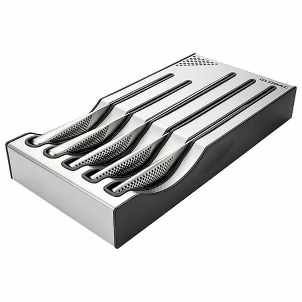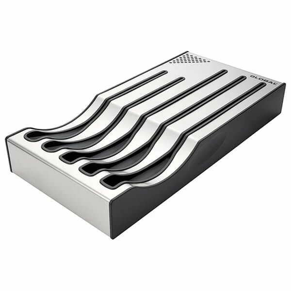 GLOBAL KNIFE DOCK – safe and hygienic, the Global knife dock is a great alternative to a traditional knife block. With iconic Global branding, the knife dock has 5 secure slots – 3 long (34cm) and 2 short (28cm) and can either be displayed on the counter or placed in a cutlery drawer. Measures W20cm x L40cm x H6cm.