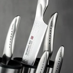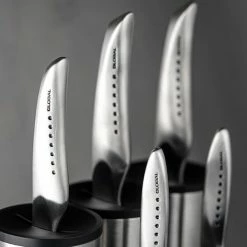 This Global Sai Cylinder Engine Block 5 Piece set, comprises: SAI-01 Chefβs knife, SAI-05 Bread knife, SAI-M06 Vegetable knife, SAI-S02 Utility knife and SAI-S01 Paring knife.