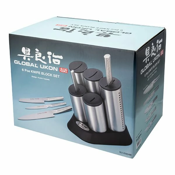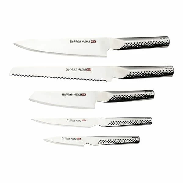This Global Ukon Cylinder Engine Block 5 Piece set, comprises: GU-01 Chefβs knife, GU-03 Bread knife, GUM-10 Vegetable knife, GUF-32 Utility knife and GUF-30 Paring knife.