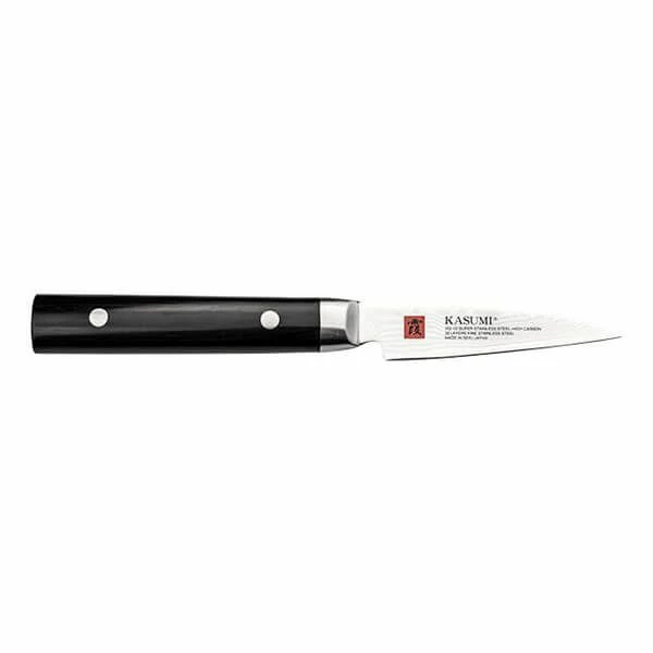 This Kasumi 8cm paring knife is made from 32 layer Damascus steel with a 59-60 Rockwell hardness.
