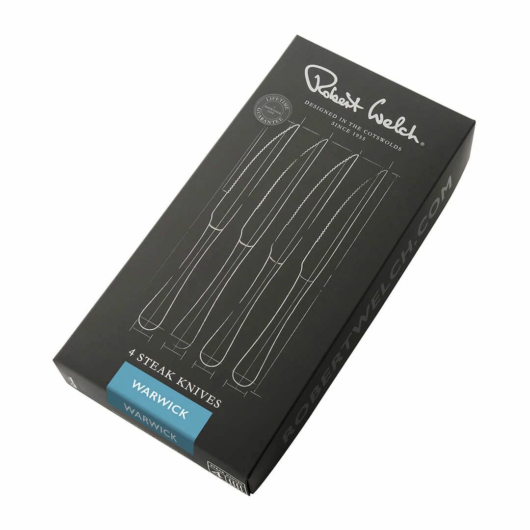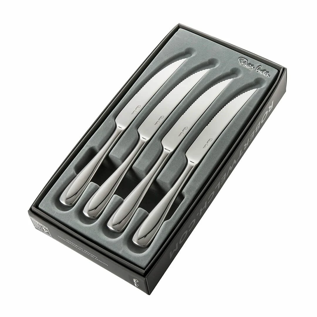 The Robert Welch Warwick Bright 4 piece steak knife set is perfect for presenting on a table setting when serving steak and other meat and features a curved and well-balanced elegant style.