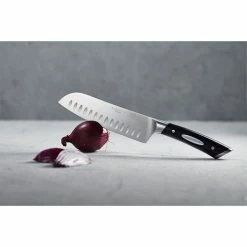 The Scanpan Classic 18cm Santoku contains a scalloped edge blades to help prevent ingredients from sticking to the knife.