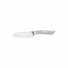 The Scanpan Classic Steel 18cm Santoku contains a scalloped edge blades to help prevent ingredients from sticking to the knife.