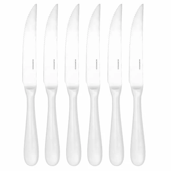 This Stellar 6 Piece Steak Knife Set is crafted from high quality stainless steel and is supplied in a distinctive gift box. Polished to a sparkling mirror finish, each knife features a serrated blade for easy cutting. Stellar Lifetime Guarantee.