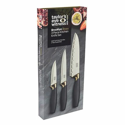 The Taylors Eye Witness Brooklyn Brass 3 piece knife set includes