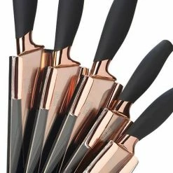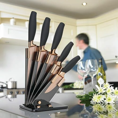 The Brooklyn Rose Gold 5 Piece Fan-Shaped Knife Block Set from Taylor’s Eye Witness includes five essential kitchen knives in a stylish clear fan-shaped knife block.