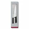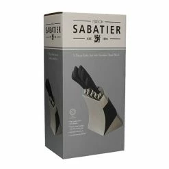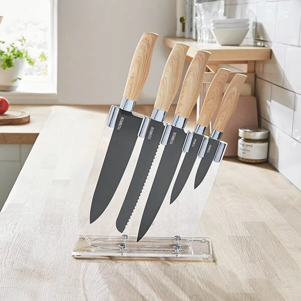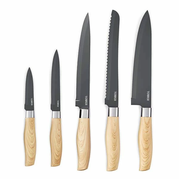 The Tower Scandi 5 piece knife block set includes 8 inch chef’s knife, 8 inch bread knife, 8 inch carving knife, 5 inch utility knife and a 3.5 inch paring knife.