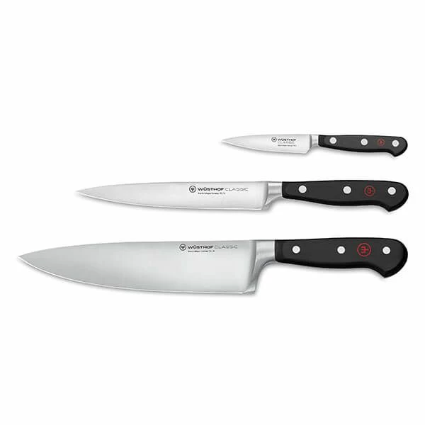 This 3 piece Wusthof classic set includes the 20cm cooks knife, 16cm utility knife and 9cm paring knife. Perfect for everyday use in the kitchen.