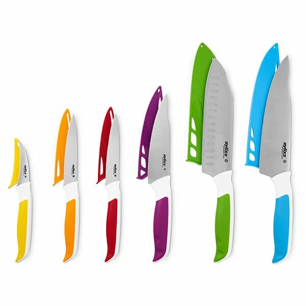 This set of 6 Zyliss knives include 18.5cm chef’s knife,18cm santoku knife, 13cm utility knife, 10.5cm serrated paring knife, 8.5cm paring knife and 6.5cm peeling knife. Each of the blades are made from high quality japanese stainless steel.