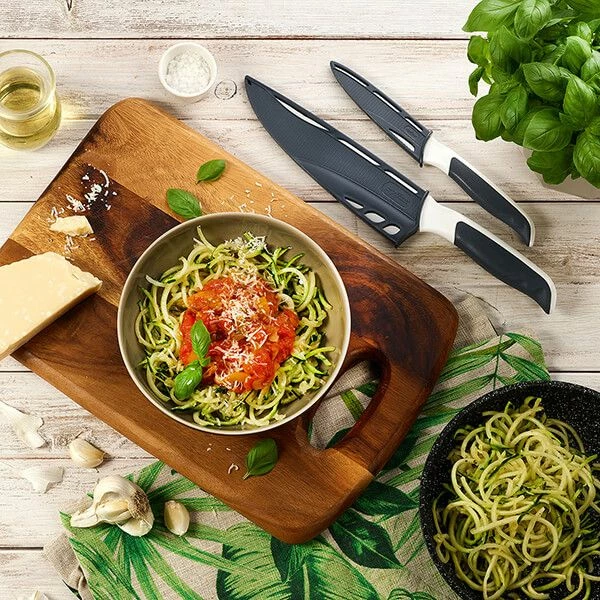 The Zyliss comfort chef’s knife features a 18.5cm blade and an ergonomic comfort handle with a finger indent for a firm grip with perfect control when slicing meat and vegetables.
